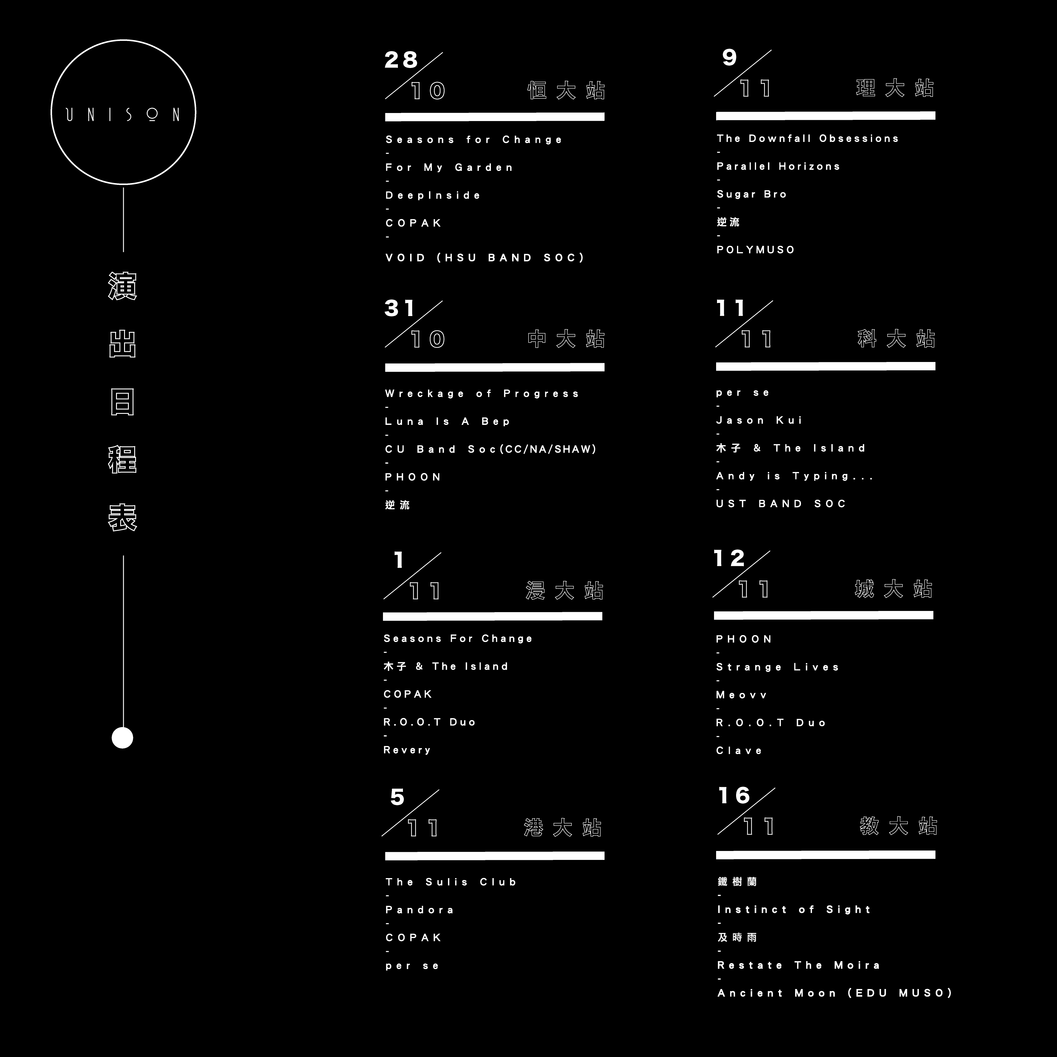 per se // DeepInside // 木子 & The Island // Parallel Horizons // Wreckage Of Progress // Andy is Typing… // Luna Is A Bep // The Sulis Club // Revery // Sugar Bro // Copak // For My Garden // Meovv // Clave // The Downfall Obsessions // Strange Lives // Restate The Moira // CU BANDSOC (CC/NA/SHAW) // POLYMUSO // UST BAND SOC //